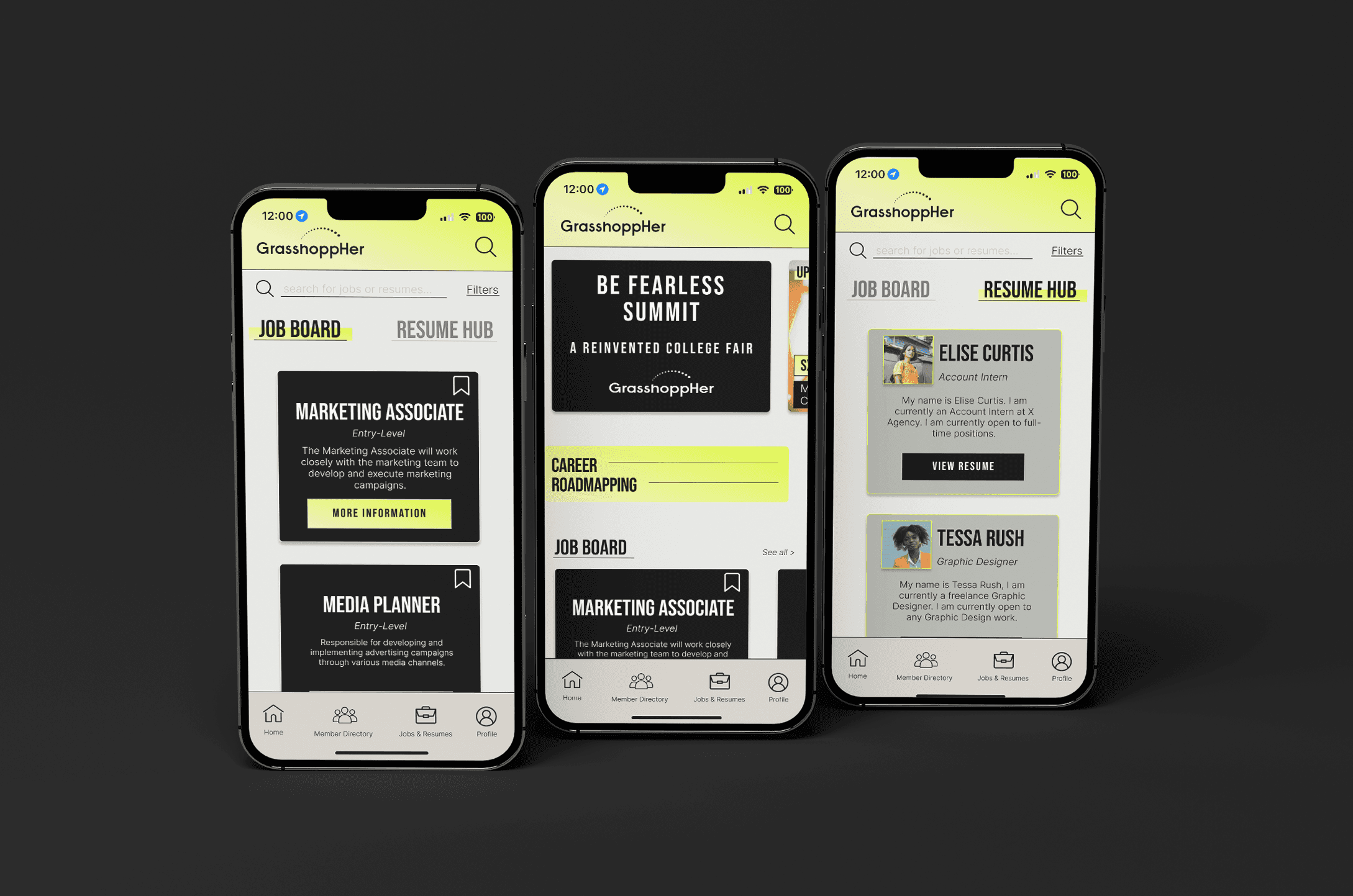 Working with a small team of four, I connected with the Founder of the GrasshoppHer, a mentorship hub for women and non-binary people, and she made it clear that GrasshoppHer was interested in adding an app to their business model. We gathered a list of most important features to have from our stakeholder and got to work doing the research. This included 8 interviews and 25 survey responses. With the results from the research, the ideation began. We went through 2 iterations before landing on the final design that utilizes the existing brand guidelines from GrasshoppHer. Check out the full wireframe here: