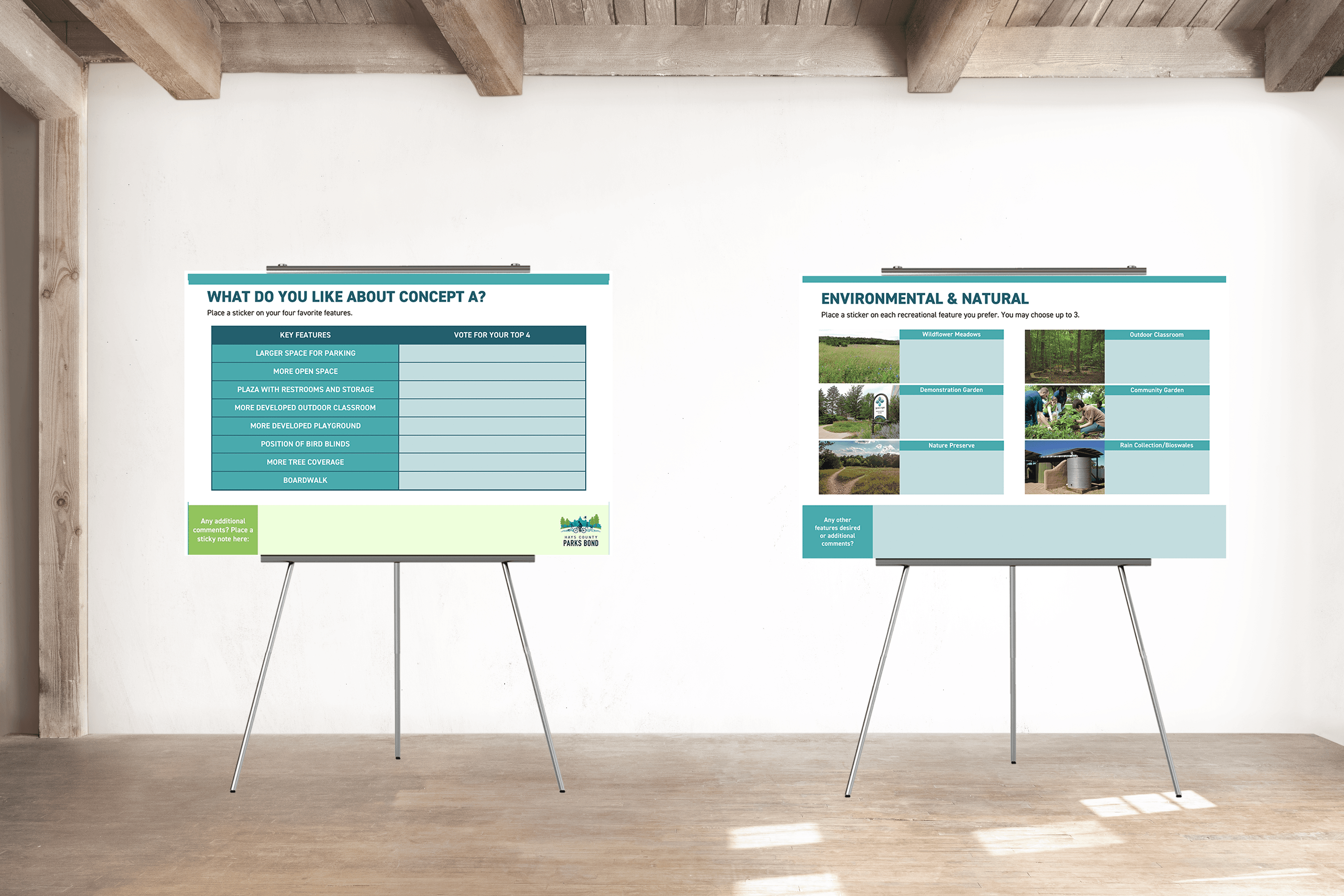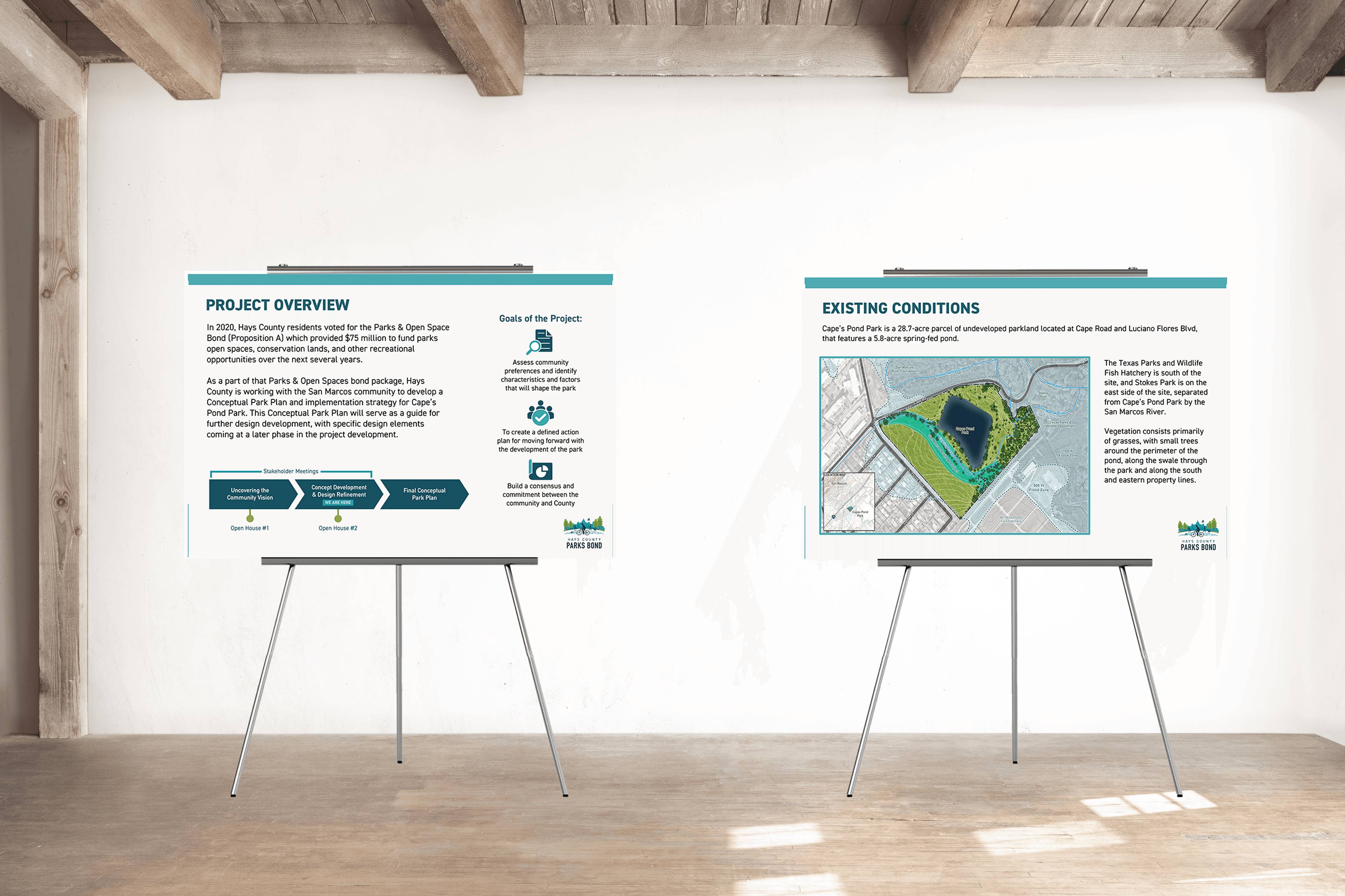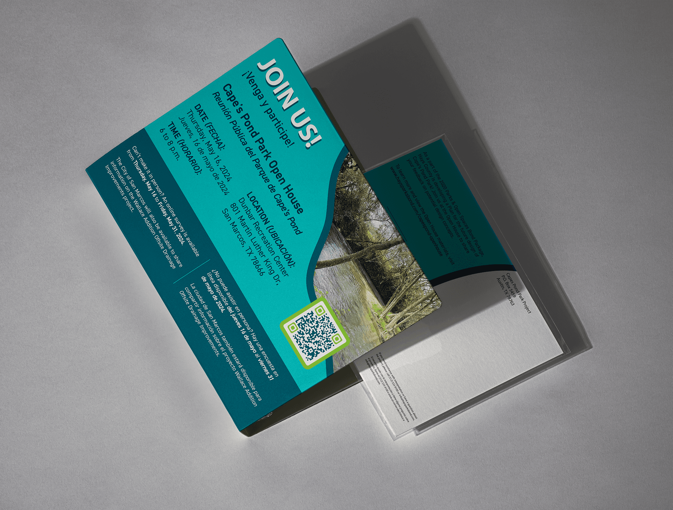Working with Hays County Parks Bond, they aimedto host two Open Houses to gather public input about Cape’s Pond Park and improvements that could bemade that would benefit the community. Thisrequired creating a post card invitation tosend to people in the community and alsocreating open house boards that allowsthe public to leave their feedback.