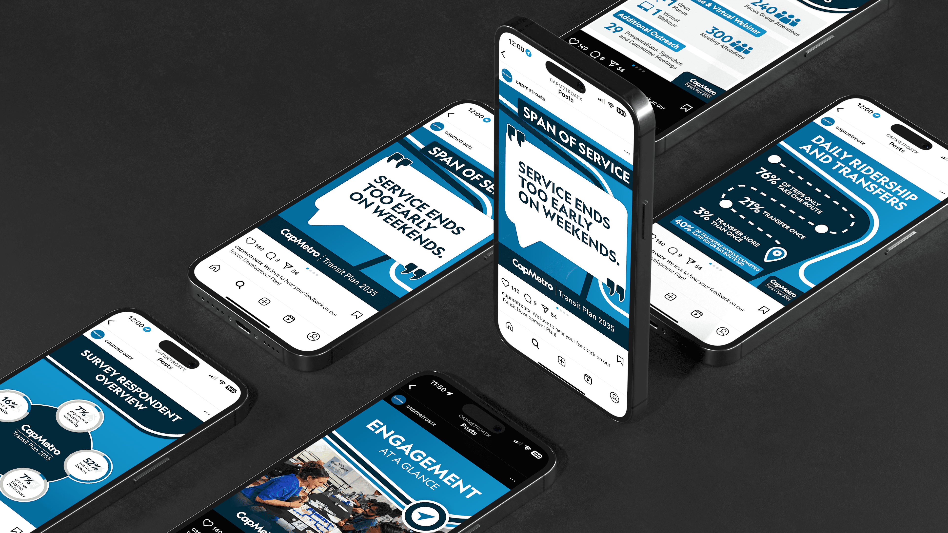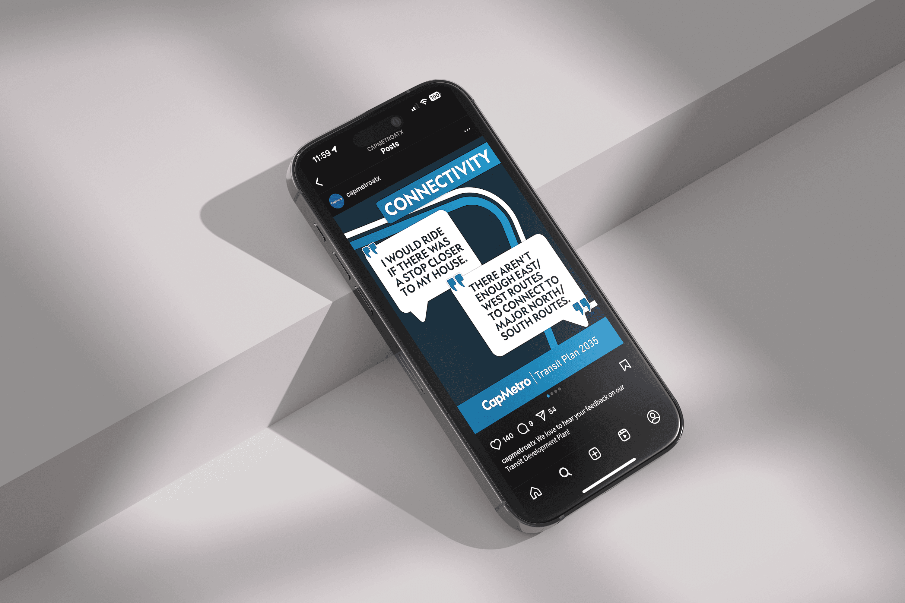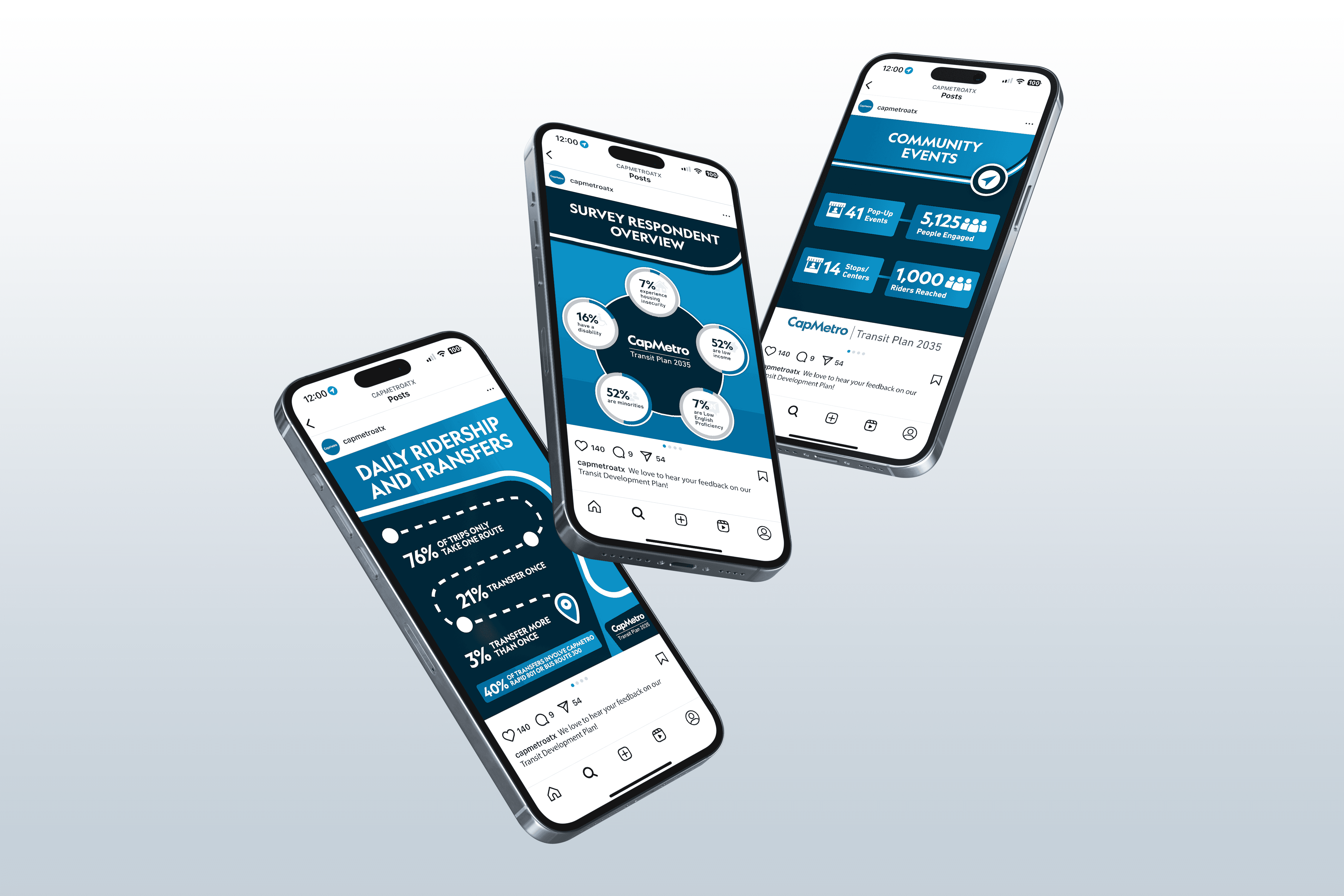 CapMetro, Austin's regional publictransportation provider, requested a seriesof social media posts within their TransitDevelopment Plan branding inorder to share the results of their public survey with Austin communities.Branding includedtype, colors, andline graphics.